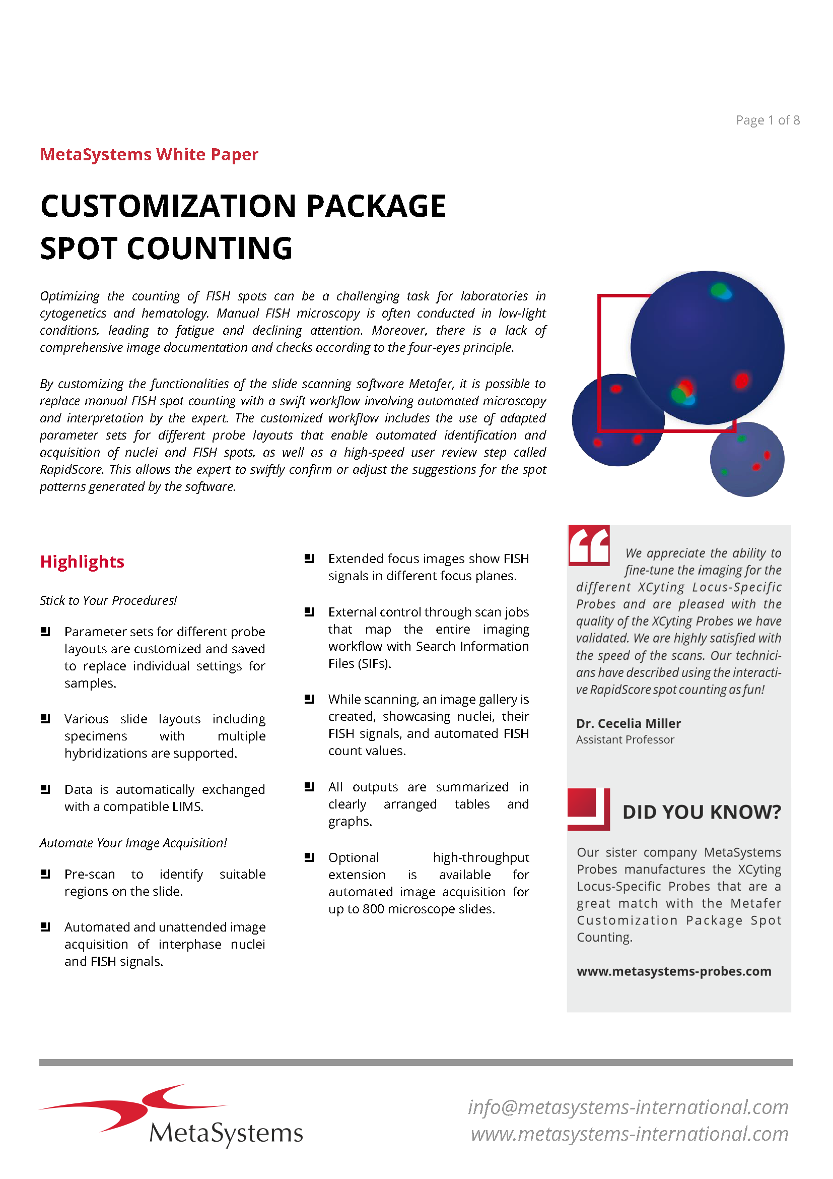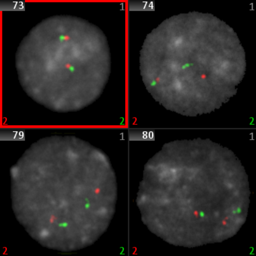The traditional manual FISH spot evaluation method is time-consuming, repetitive, error-prone, and often conducted under poor lighting conditions, leading to fatigue and decreased accuracy. Additionally, it lacks comprehensive image documentation and the necessary checks required by the dual control principle. MetaSystems enables users to establish a method that integrates imaging automation with human expertise to streamline FISH spot counting. The Customization Package for Spot Counting facilitates the creation of a flexible workflow that adapts to various locus-specific probes and supports different probe layouts, preparation methods, and color channels. This approach allows users to leverage the benefits of digital image processing while ensuring quick and easy confirmation of results, along with complete documentation in the form of images and process data.
