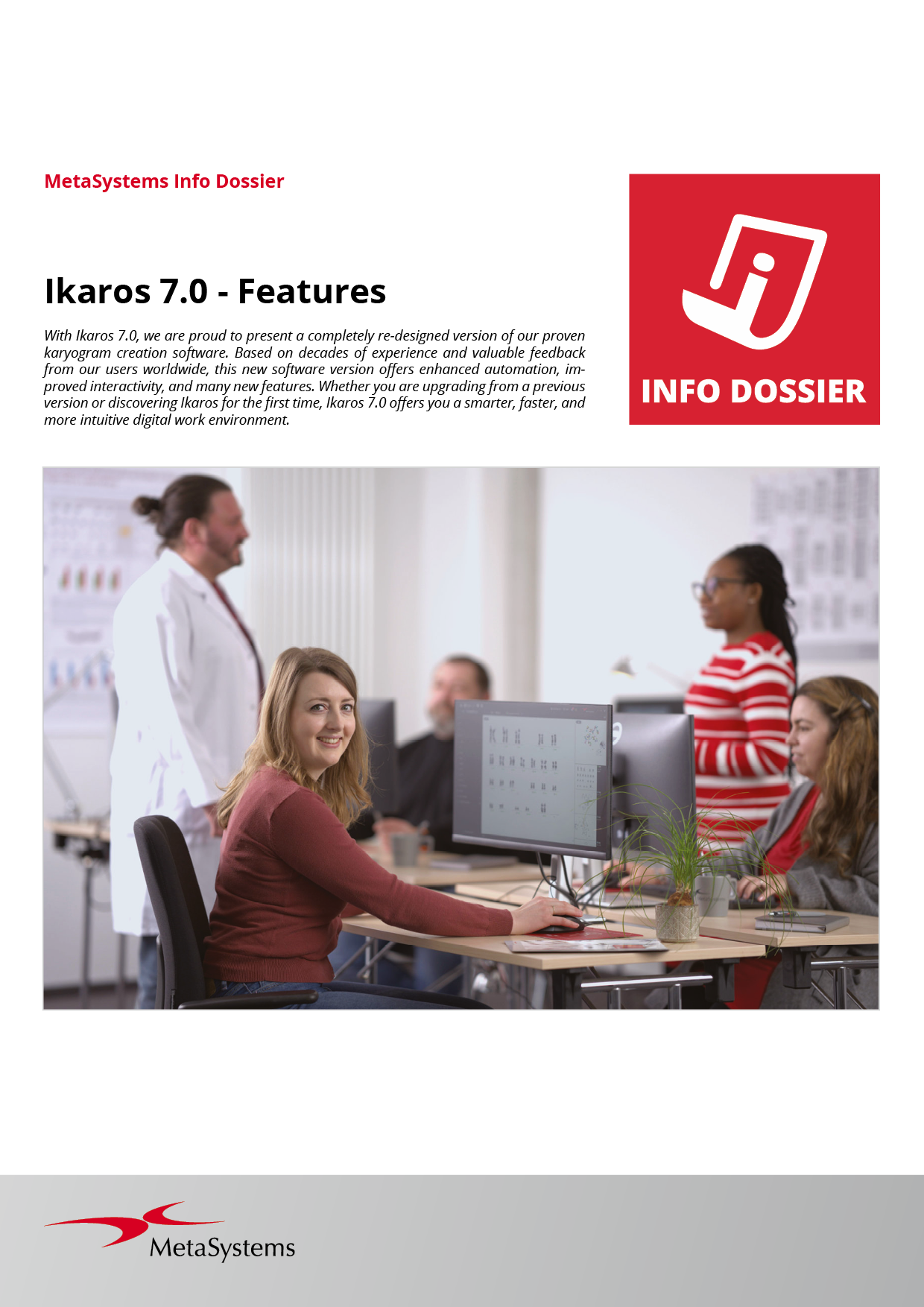 Discover the next generation of fluorescence color imaging with Ikaros 7 by MetaSystems. Built to deliver both clarity and flexibility, Ikaros 7 enhances the visualization of even the most subtle fluorescence signals, supporting precise and detailed analysis. Integrated workflows simplify complex tasks, reducing manual steps and ensuring a smooth, efficient imaging process from acquisition to evaluation.